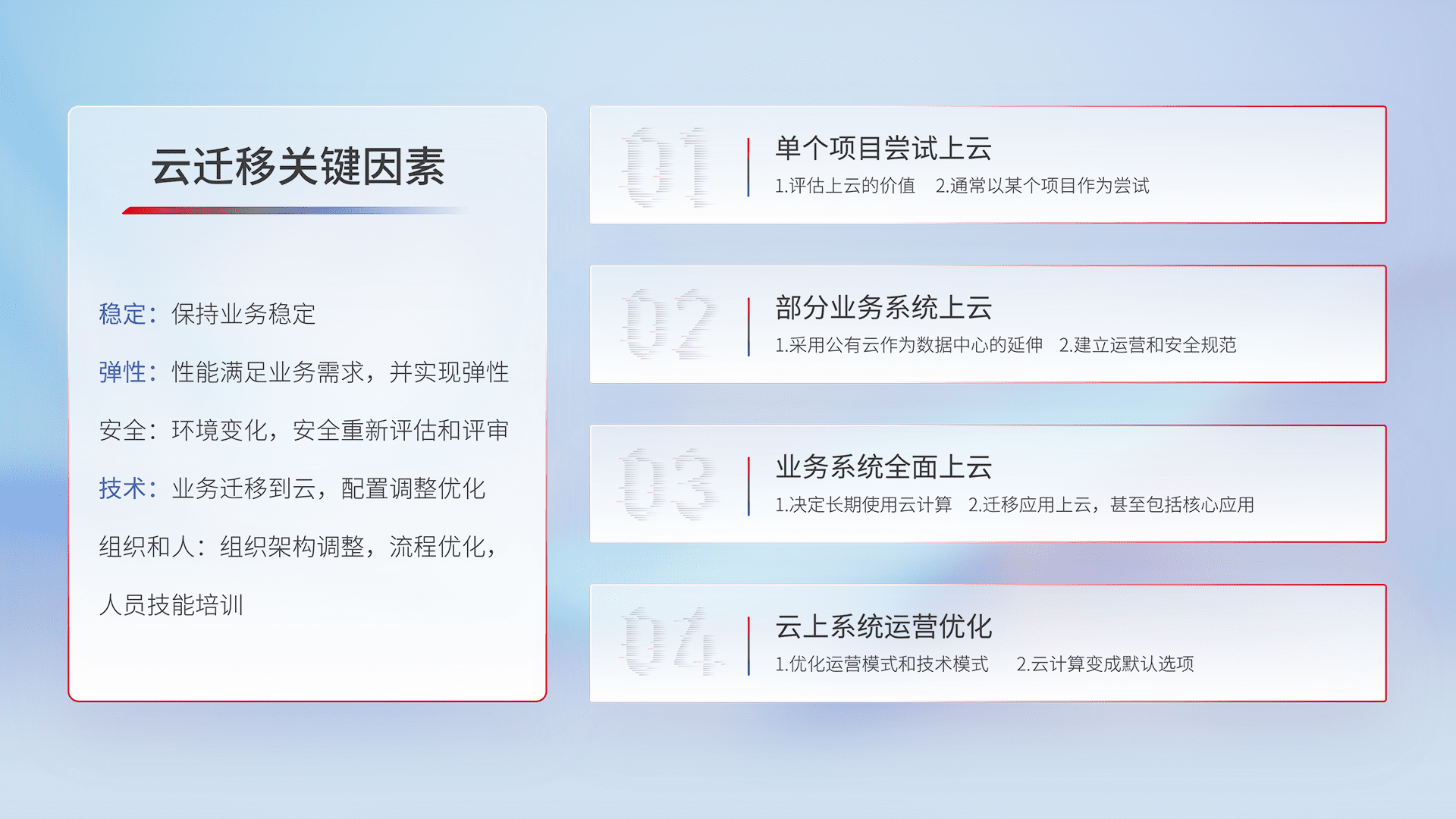 结合实际业务,,,,从规划设计、、、、云平台选型、、、云原生改造、、数据迁移、、、集成交付,,,,迁移全过程为客户识别最佳上云路径,,做好风险识别管理,,设计网络架构、、身份权限、、、、安全审计合规、、、操作审计、、、、日志审计、、、监控告警策略、、、、多站点容灾设计等,,,对云上基础设施进行整体规划,,,,提升IT治理水平,,,以满足弹性、、高可用、、、、高性能的需求。。。。