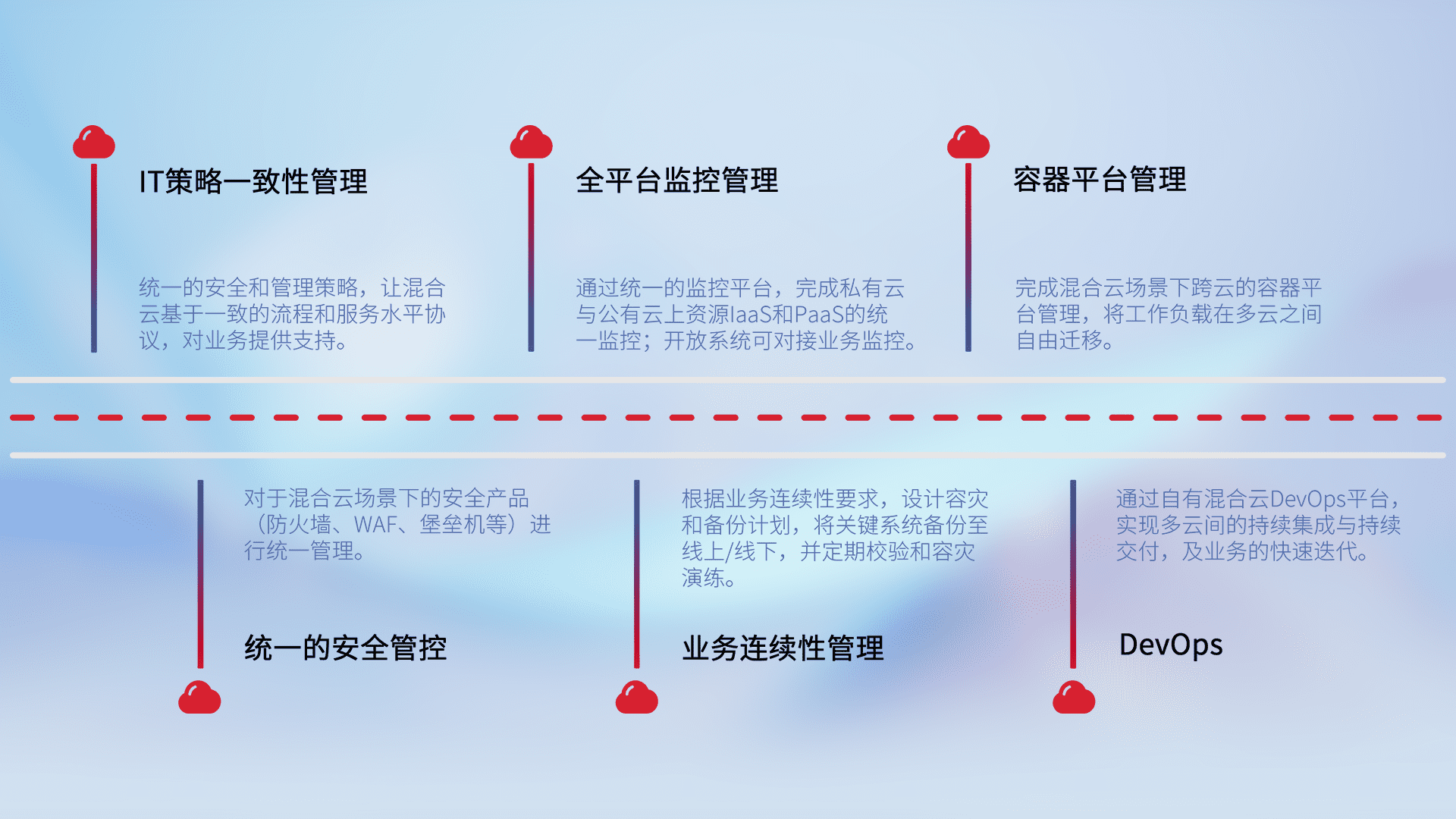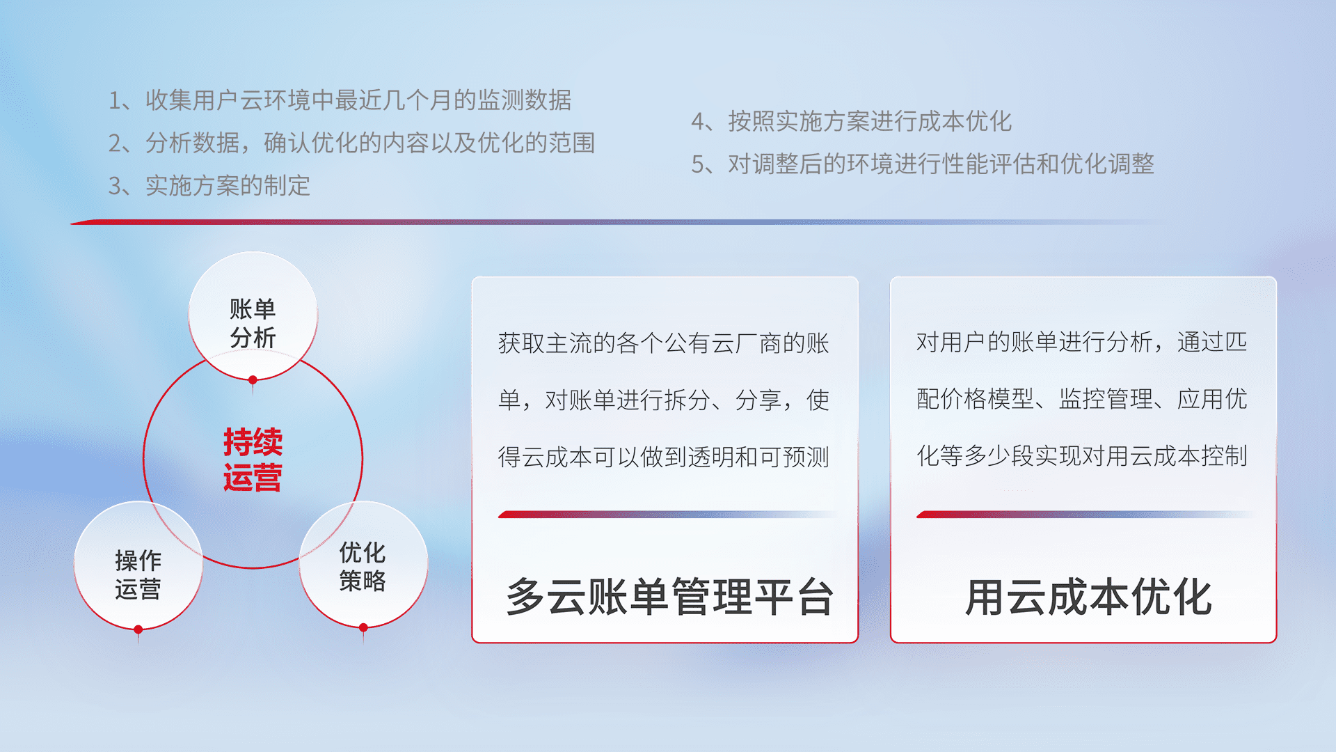 通过多云纳管,,,,以统一的资源数据模型把客户的云资源进行抽象和封装,,进而实现对多云资源的统一操作,,保障云资源管理的可靠性、、、稳定性与可用性。。。。量身定制化运维内容,,配置、、开发运维、、、、补丁管理、、、备份、、、、监控、、认证和访问管理、、审计和日常巡检等,,,,保障在用云过程中的可靠度,,稳定度以及高可用率。。。