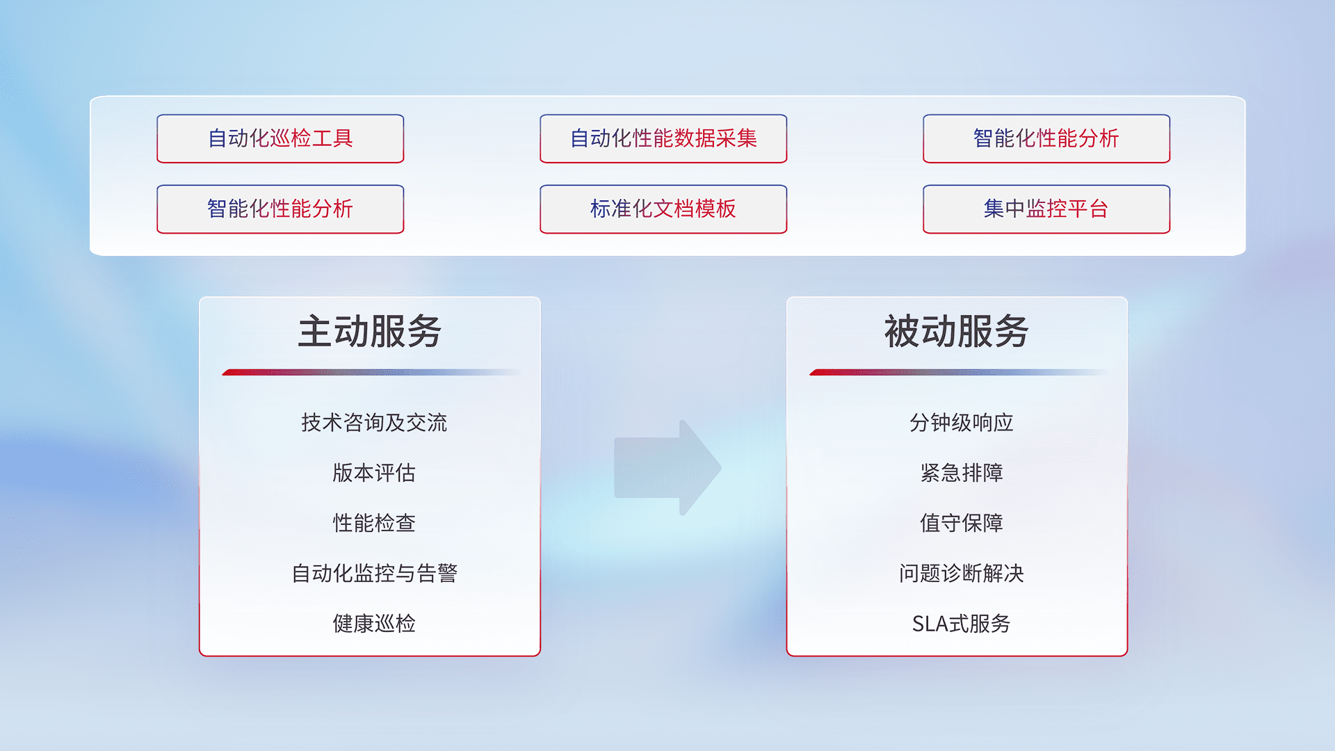 智能化工具和标准化文档,,保障服务质量,,,提供主动服务(包含技术咨询、、版本评估、、、性能检查、、、、自动化监控与告警、、、、健康巡检)和被动服务包含(分钟级响应、、紧急排障、、值守保障、、问题诊断解决、、SLA服务)。。。